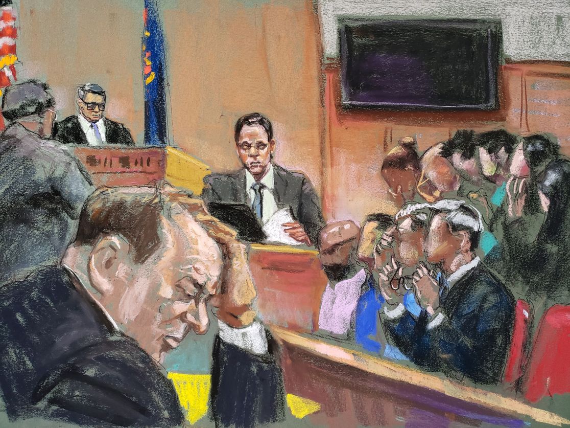 | Harvey Weinstein listens to testimony being read back during jury deliberations yesterday. Courtroom sketch: Jane Rosenberg for Reuters The jury (seven men, five women) "in Harvey Weinstein's sexual assault trial in New York said ... they were deadlocked on the most serious criminal charges and suggested they were unanimous on the others," per Reuters. - "The jurors asked Justice James Burke ... whether they could be hung on the two counts of predatory sexual assault and unanimous on the other three, which include first-degree rape," Reuters adds.