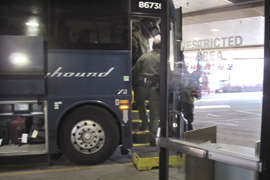 | Customs and Border Protection agents board a Greyhound bus in Spokane, Wash., on Feb. 13. Photo: Nicholas K. Geranios/AP Greyhound said it will stop allowing Border Patrol agents without a warrant to board its buses to conduct routine immigration checks, AP reports. - The company said it'll notify the Department of Homeland Security that it does not consent to unwarranted searches on its buses or in areas of terminals that are not open to the public.